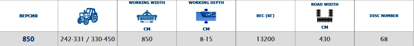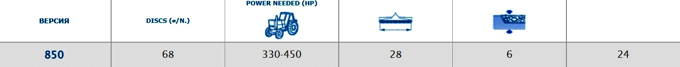 Модель ADMIRAL 850 оснащена 68 отдельно установленными дисками, расположенными в 4 ряда с разнесением 508 мм. Широкое разнесение между дисками в ряду обеспечивает плавное прохождение растительных остатков даже на сильно деформированном грунте или влажных и липких почвах с минимальным риском разбивания машины.